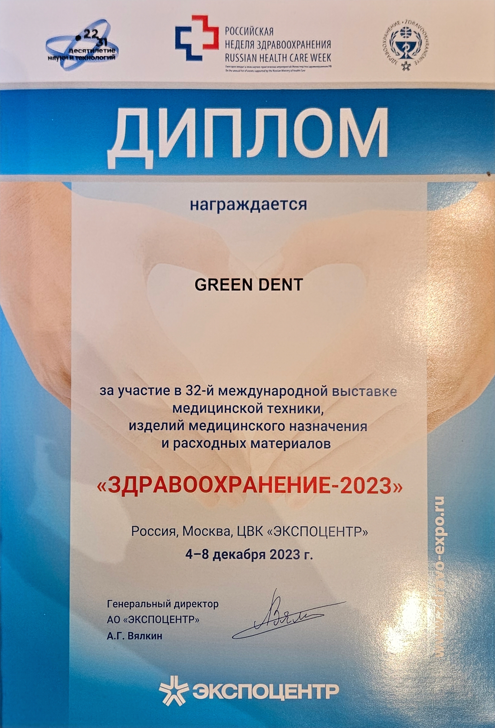 Диплом GREEN DENT за участие в 32-й международной выставке медицинской техники, изделий медицинского назначения и расходных материалов «ЗДРАВООХРАНЕНИЕ-2023»