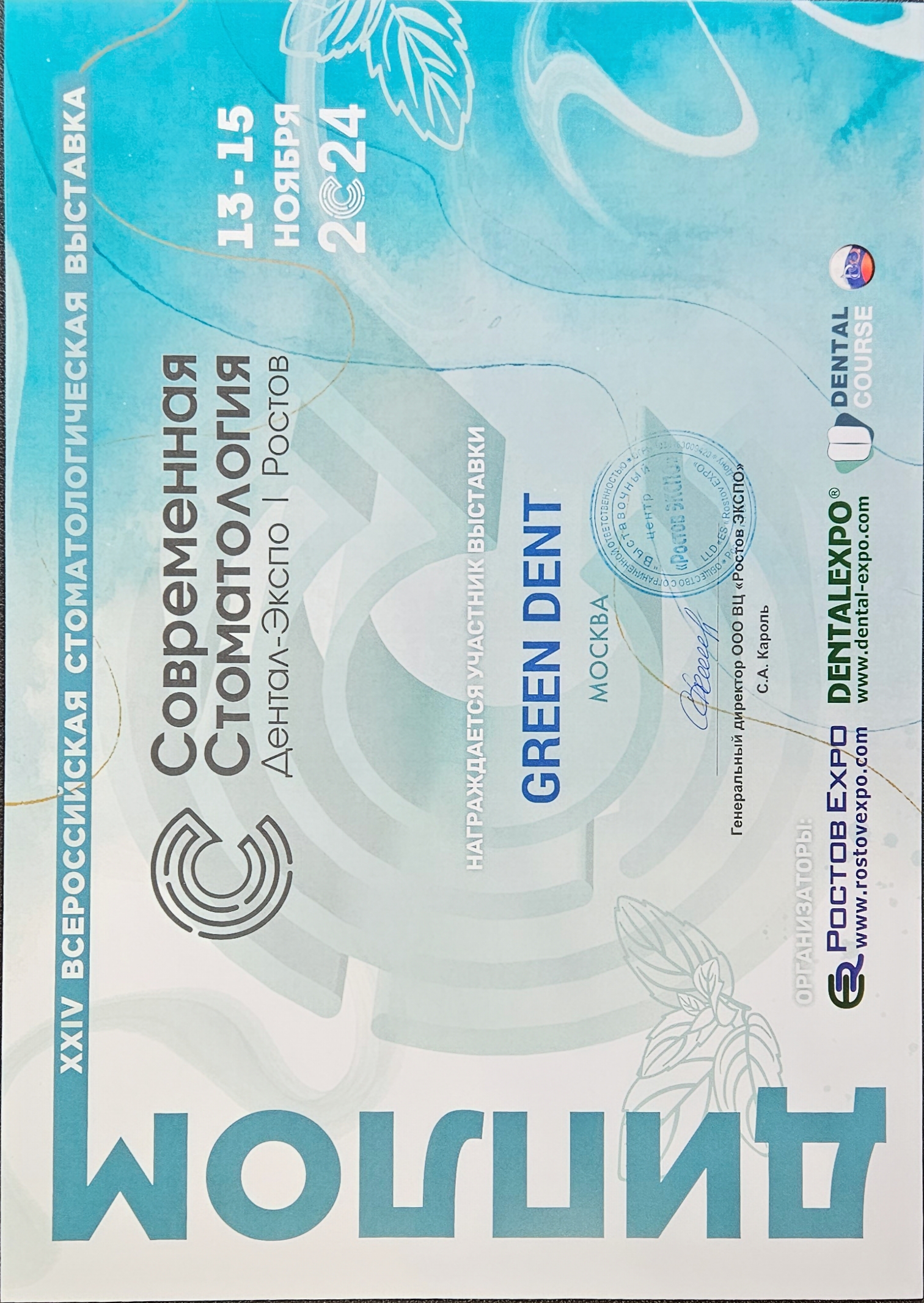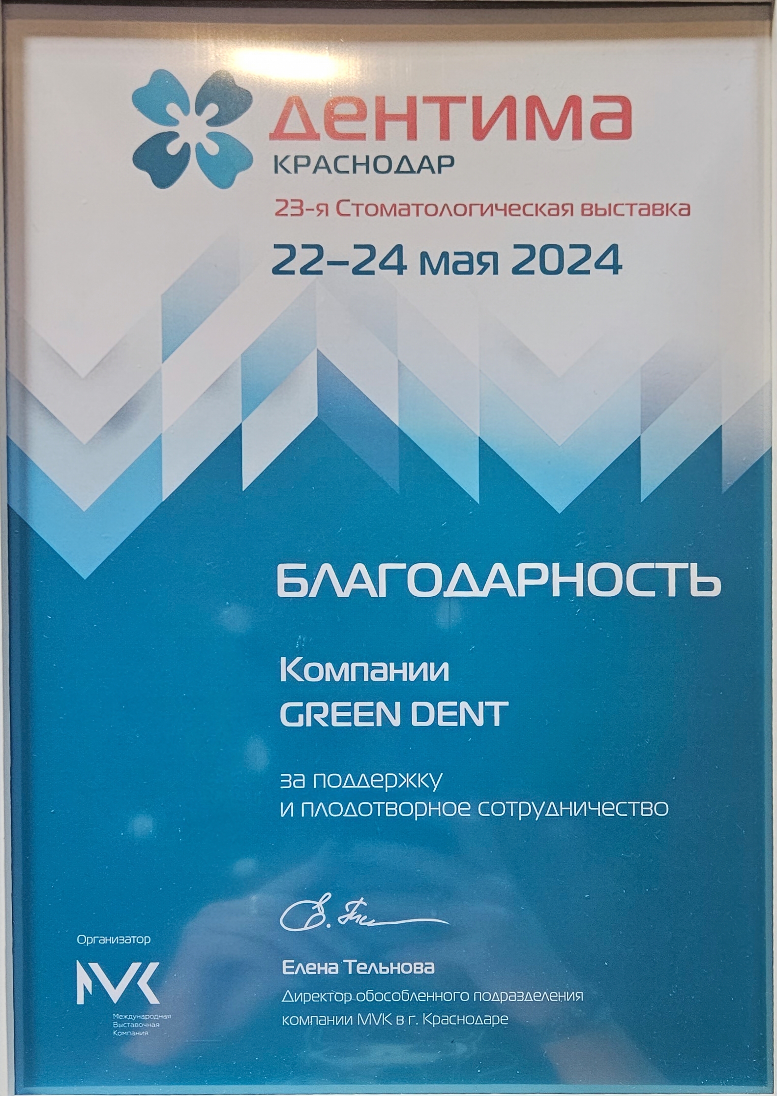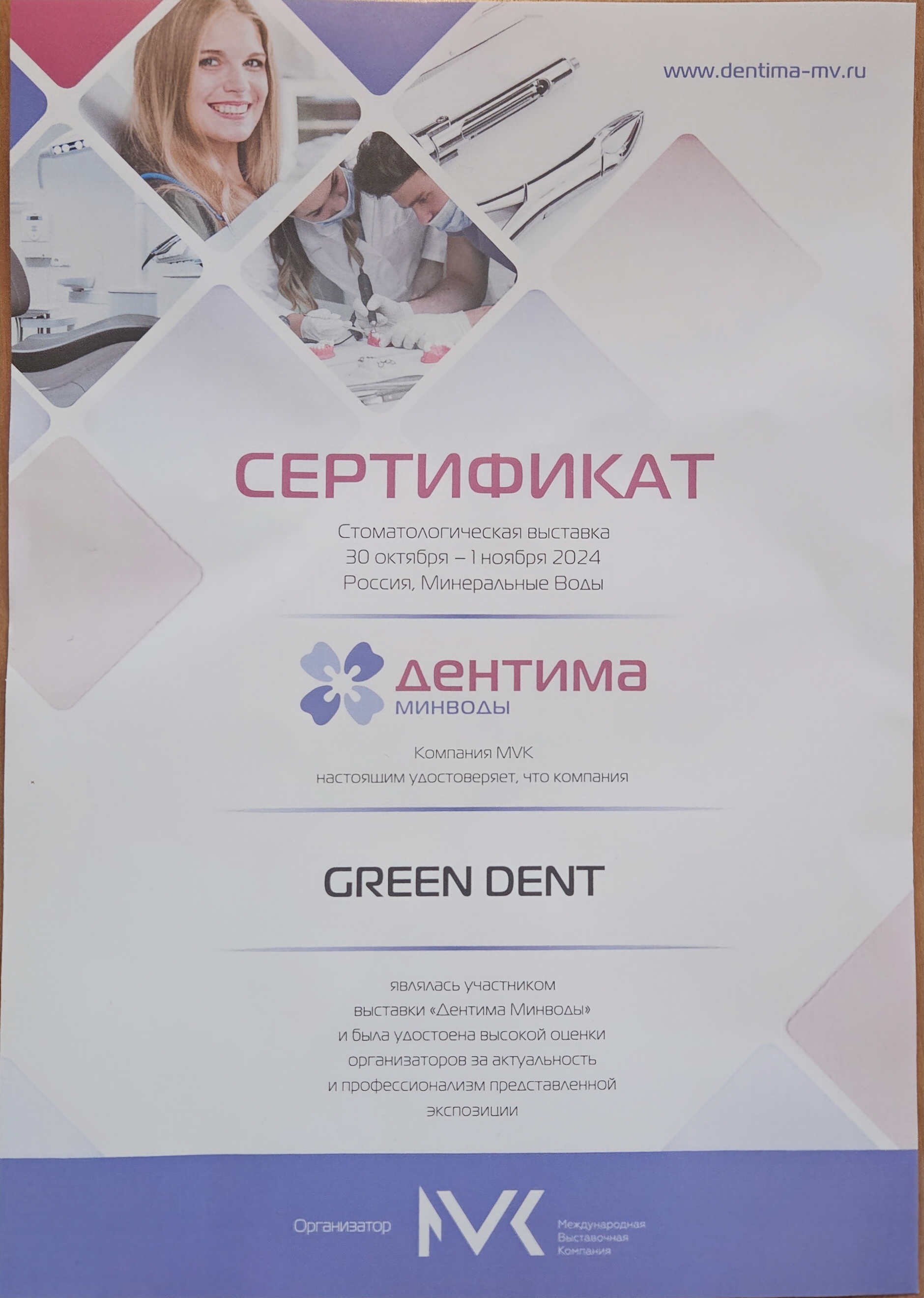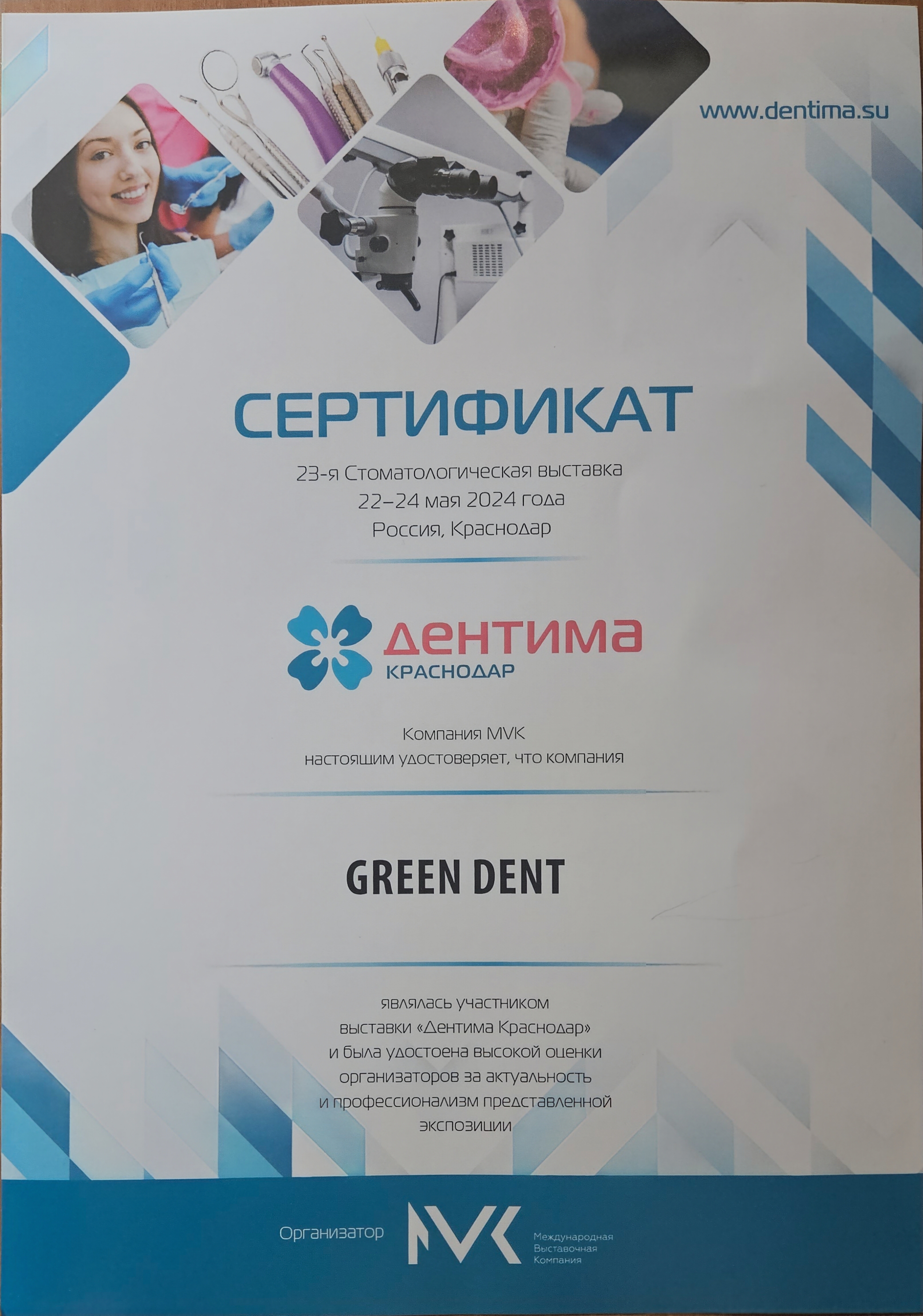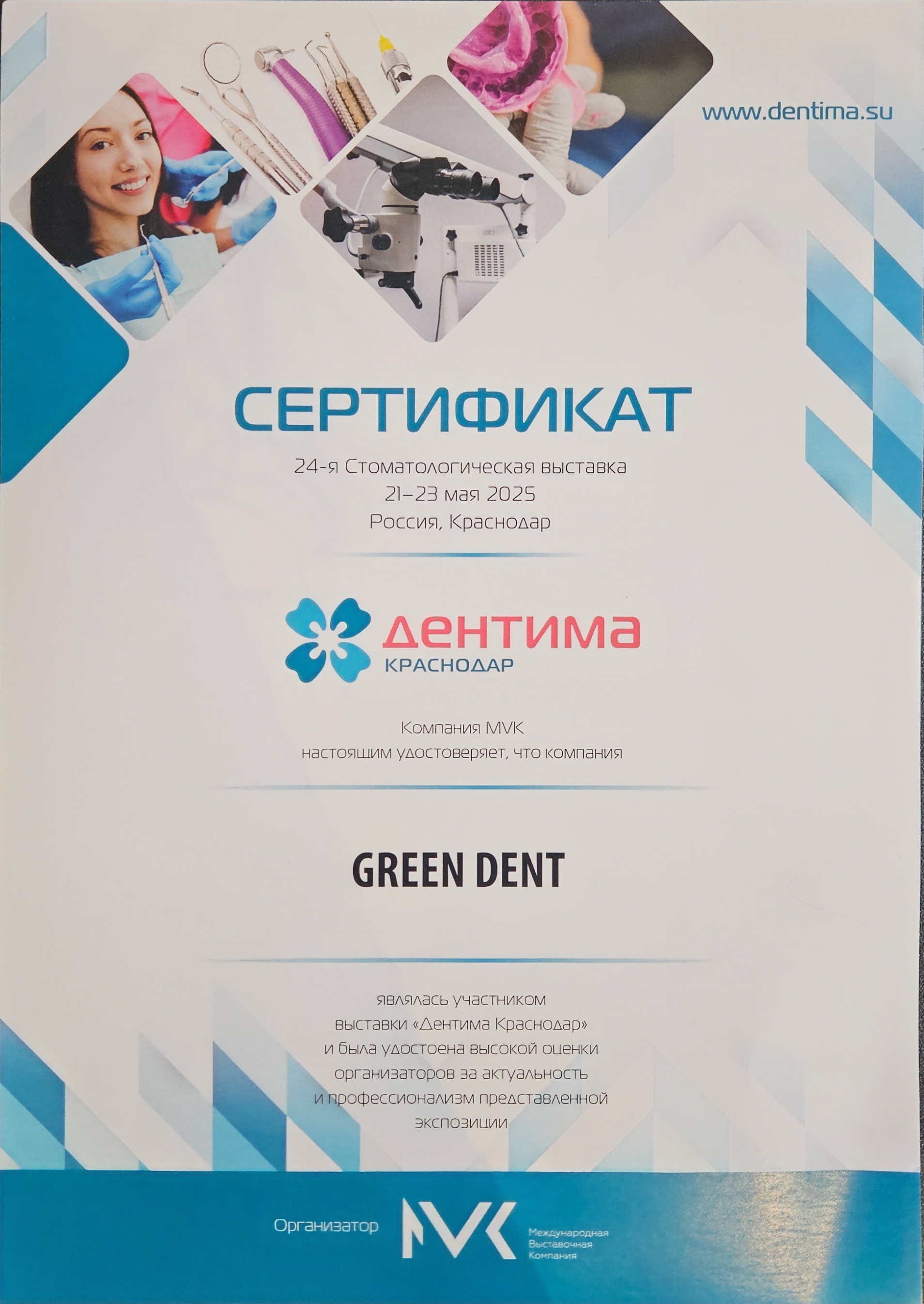 Компания MVK настоящим удостоверяет, что компания GREEN DENT являлась участником выставки «Дентима Краснодар» и была удостоена высокой оценки организатора за актуальность и профессионализм представленной экспозиции.