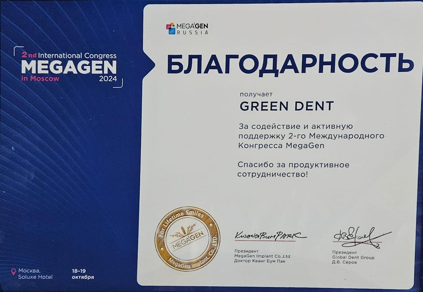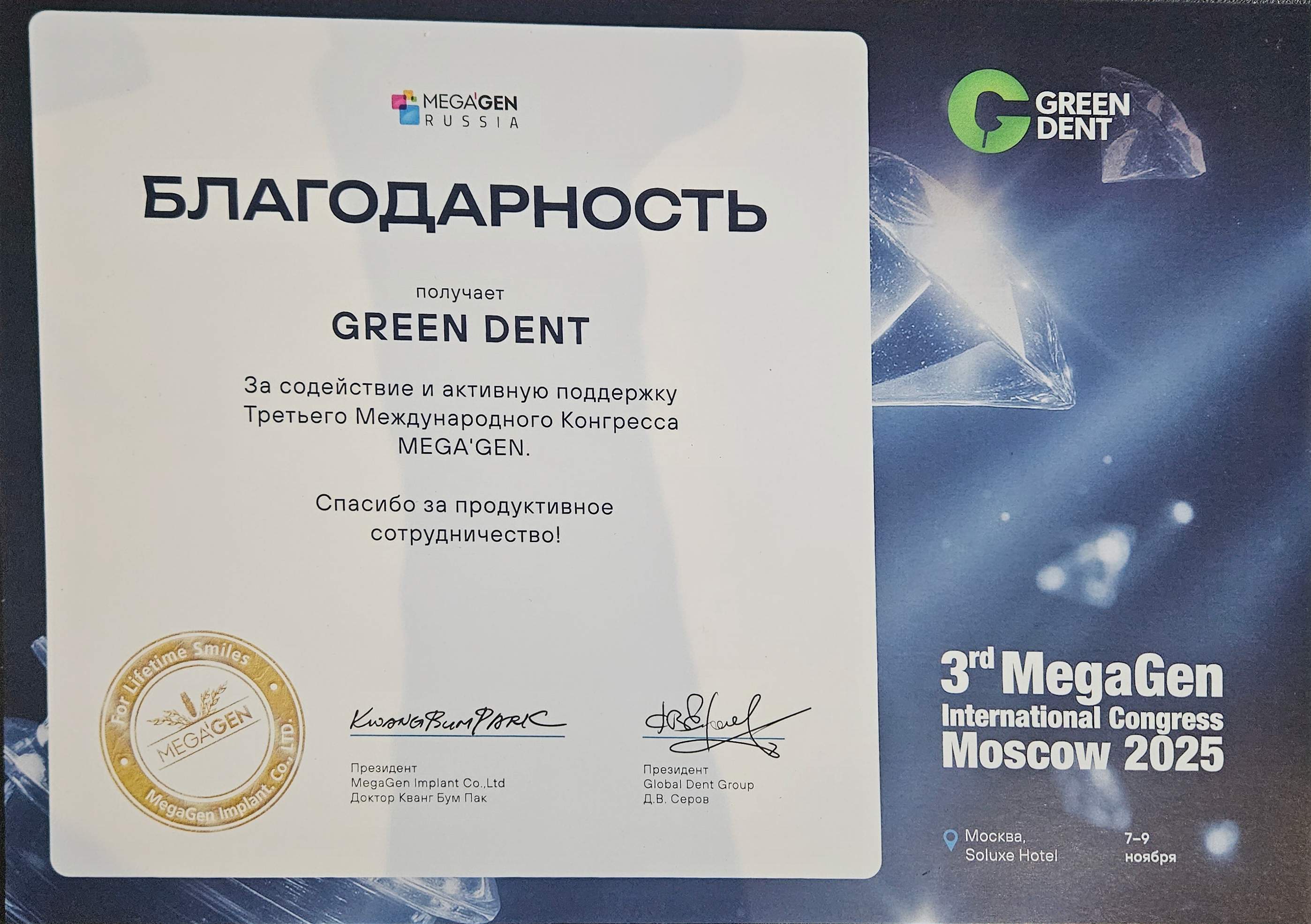 Благодарность MegaGen 7-9 ноября 2025